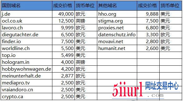排名第二的是英文组合域名medicarehelpline.com注册于2005年,有“医疗帮助线路”之意,天然适合用于医疗领域,尤其适合搭建医疗公益网站。该域名成交价为14,980美元,约合人民币10万元。 紧随其后的是数字域名97222.com,成交价为13,000美元,约合人民币8.6万元。该域名整体字符较为简短,而且五个字符中又有三个相同数字,非常好记,无论是用于游戏、娱乐、金融还是电商、门户网站等都比较适宜。 同样以五位数美元成交的.com域名还有fenomen.com和buildmaker.com,成交价分别为10,130美元和10,000美元。前者对应一个蜡烛品牌费诺门,后者则是“建立者”的意思。 国别域名方面,单字母j.de可谓大放异彩,以49,000欧元高价成交。后缀.de是德国国别域名,字母J含义丰富,可与之组合的词语也十分多,所以可应用的空间相当广阔,市场价值不菲。 三字母域名ocl.co.uk同样也拍出不错价格,以12,500英镑紧随其后。字母OCL对应有不少缩写词,比如“对象约束语言”、“省去输入电容”等,可挖掘的含义较为丰富。 其他域名交易情况,详见下表: